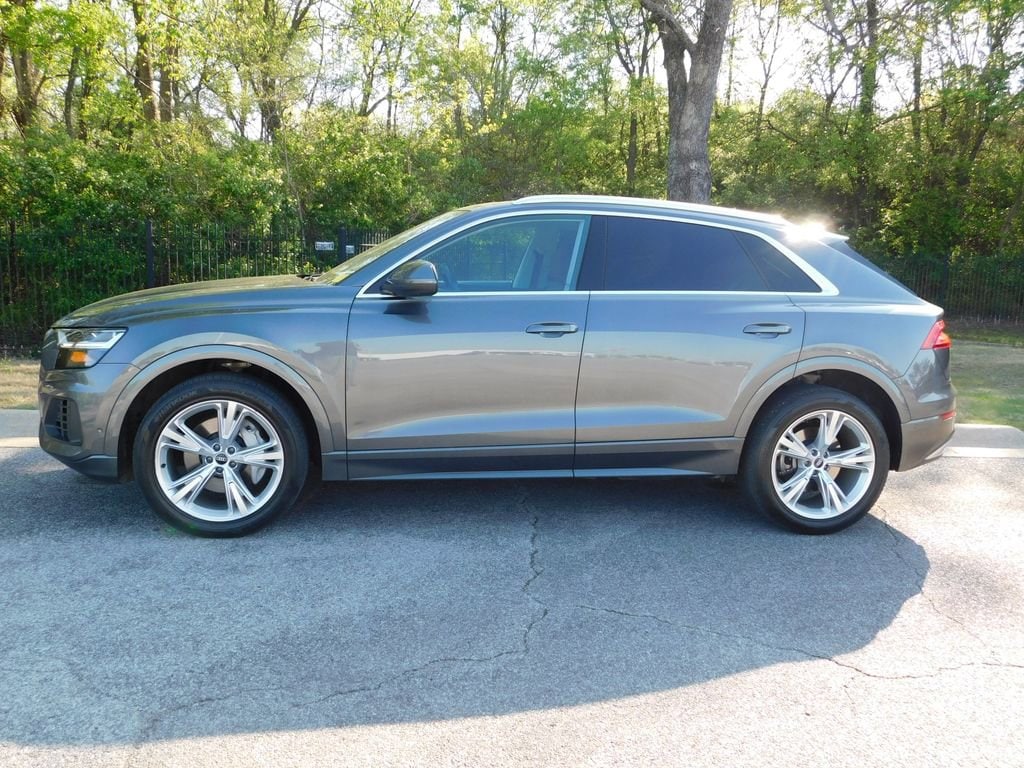 The exterior of the Q8 exudes a bold, sophisticated presence with its Samurai Gray Metallic finish and sleek, aerodynamic design. The 20-inch 5-Arm Design alloy wheels, power liftgate, and adaptive suspension further enhance the vehicle's dynamic capabilities and refined aesthetics.